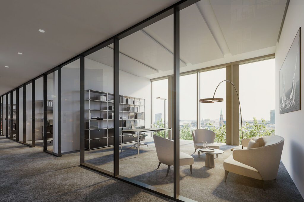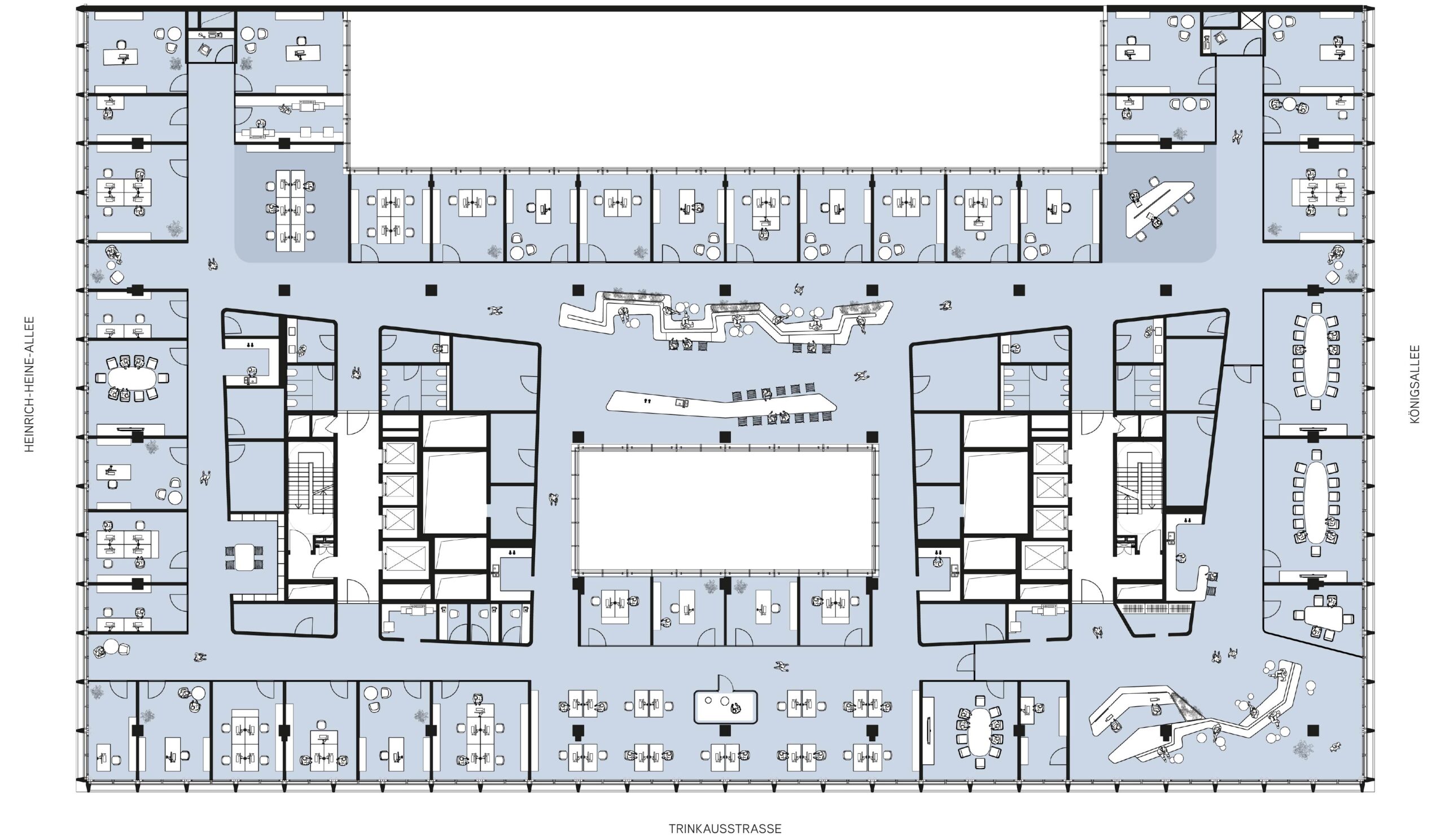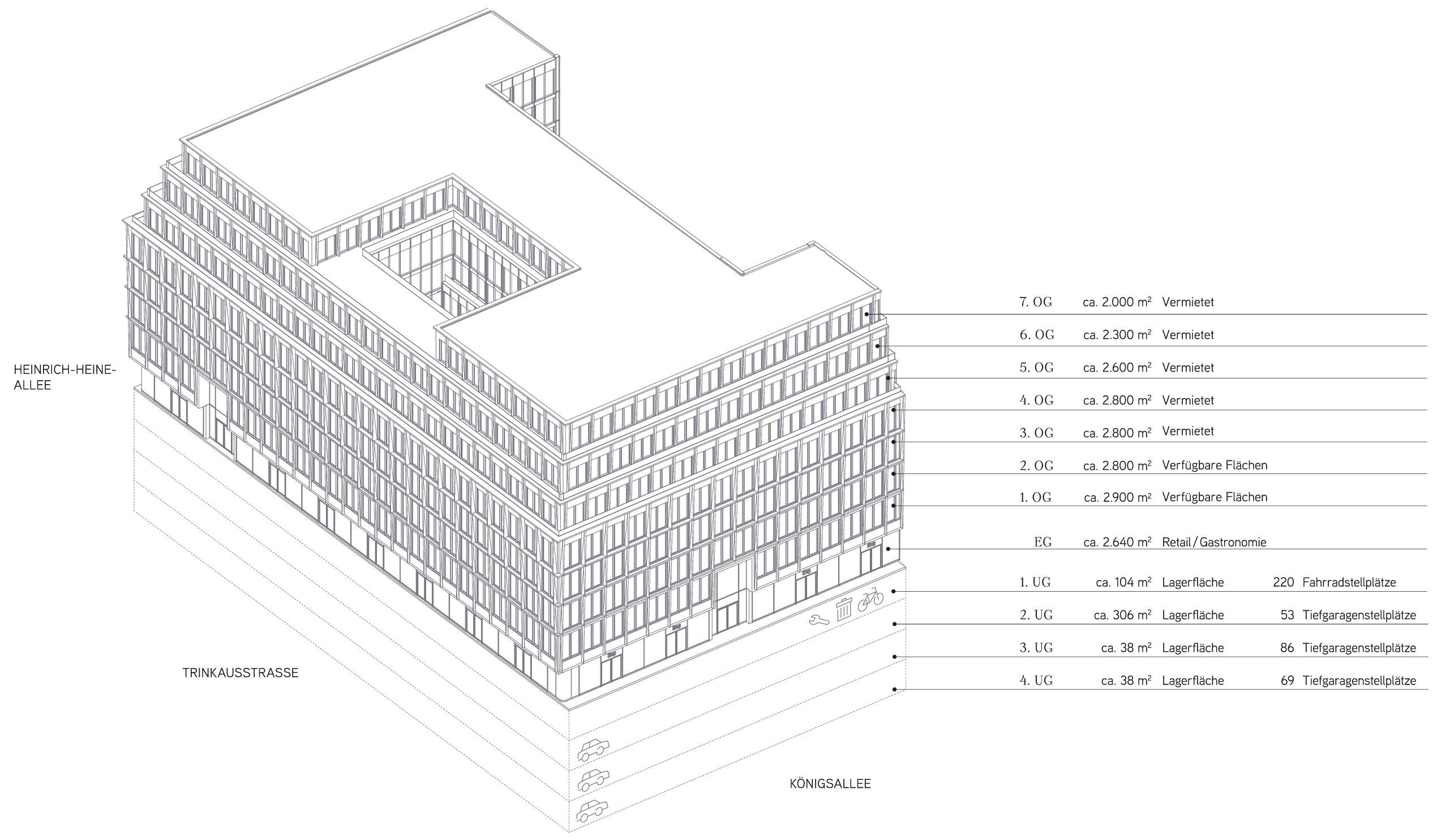 Der Zugang zu den Büroetagen erfolgt über ein repräsentatives, elegant gestaltetes und zweigeschossiges Foyer mit Eingängen in der Königsallee und Trinkausstraße. Die Büroflächen zeichnen sich durch ein hochwertiges Ambiente aus, welches sich in den edlen und zum Teil recyclebaren Baustoffen sowie modernster Gebäudetechnik widerspiegelt. Durch die Balkone entstehen zusätzliche Austrittsräume mit Aussicht auf die Stadt und die Königsallee – ein Mehr an Aufenthaltsqualität für alle.