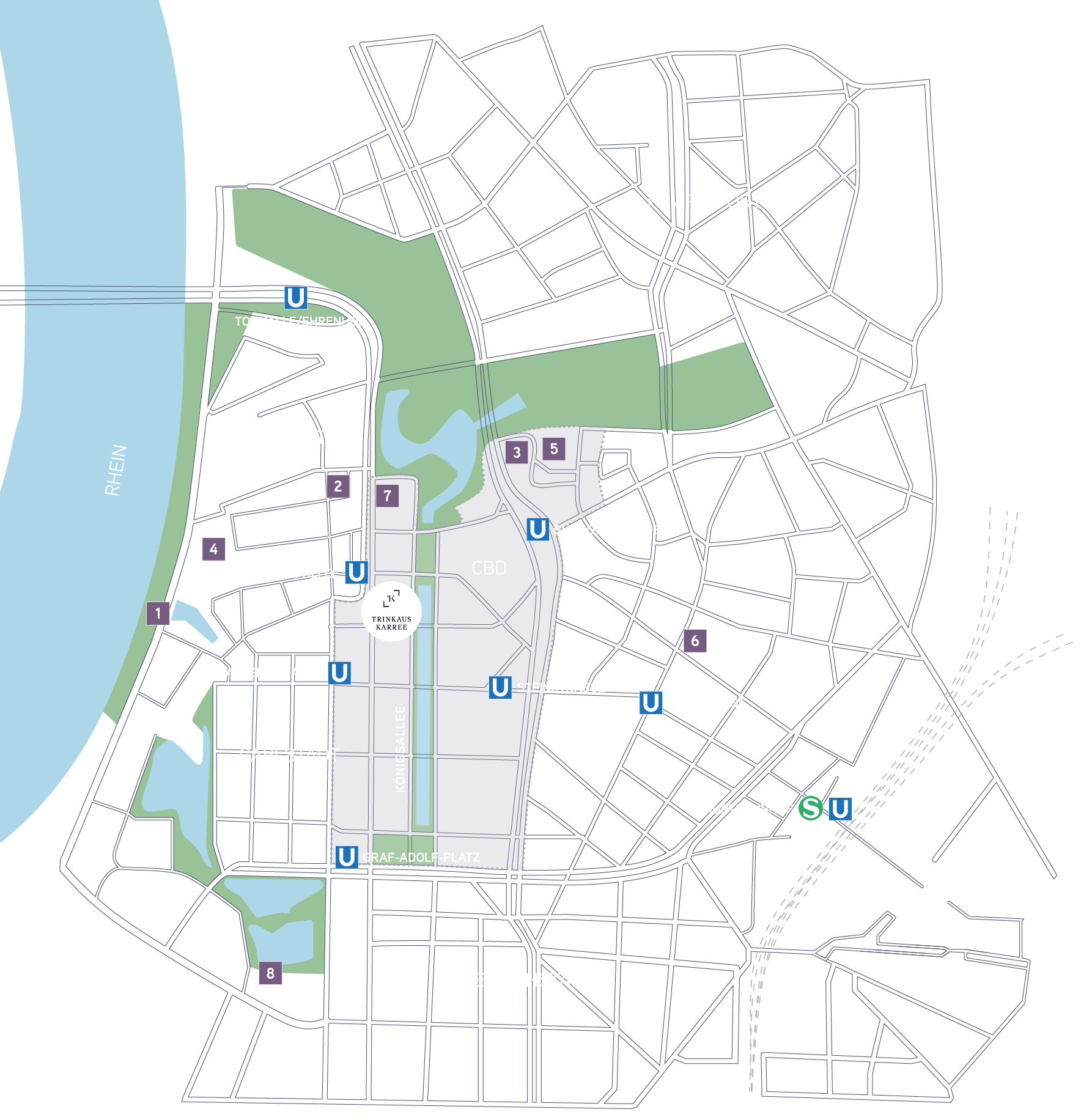 Eine Stadt mit Geschichte und Zukunft, mit hervorragender Infrastruktur und mit internationalem Flughafen, die sich trotz Expansion und Modernität ihren individuellen Charme bewahrt hat. Insbesondere im Zentrum zeichnet sich die Rheinmetropole durch kurze Wege aus und bietet ein lebendiges Miteinander und vereint Business und Lifestyle – mit exklusiven Stores und Hotels sowie Kunst und Kulinarik. Hier, im Zentrum der Stadt, an der Königsallee, die Düsseldorfs Internationalität und Eleganz repräsentiert, wird das TRINKAUS KARREE zum neuen attraktiven Blickpunkt und zur nachhaltigen Bereicherung der Stadtkultur.