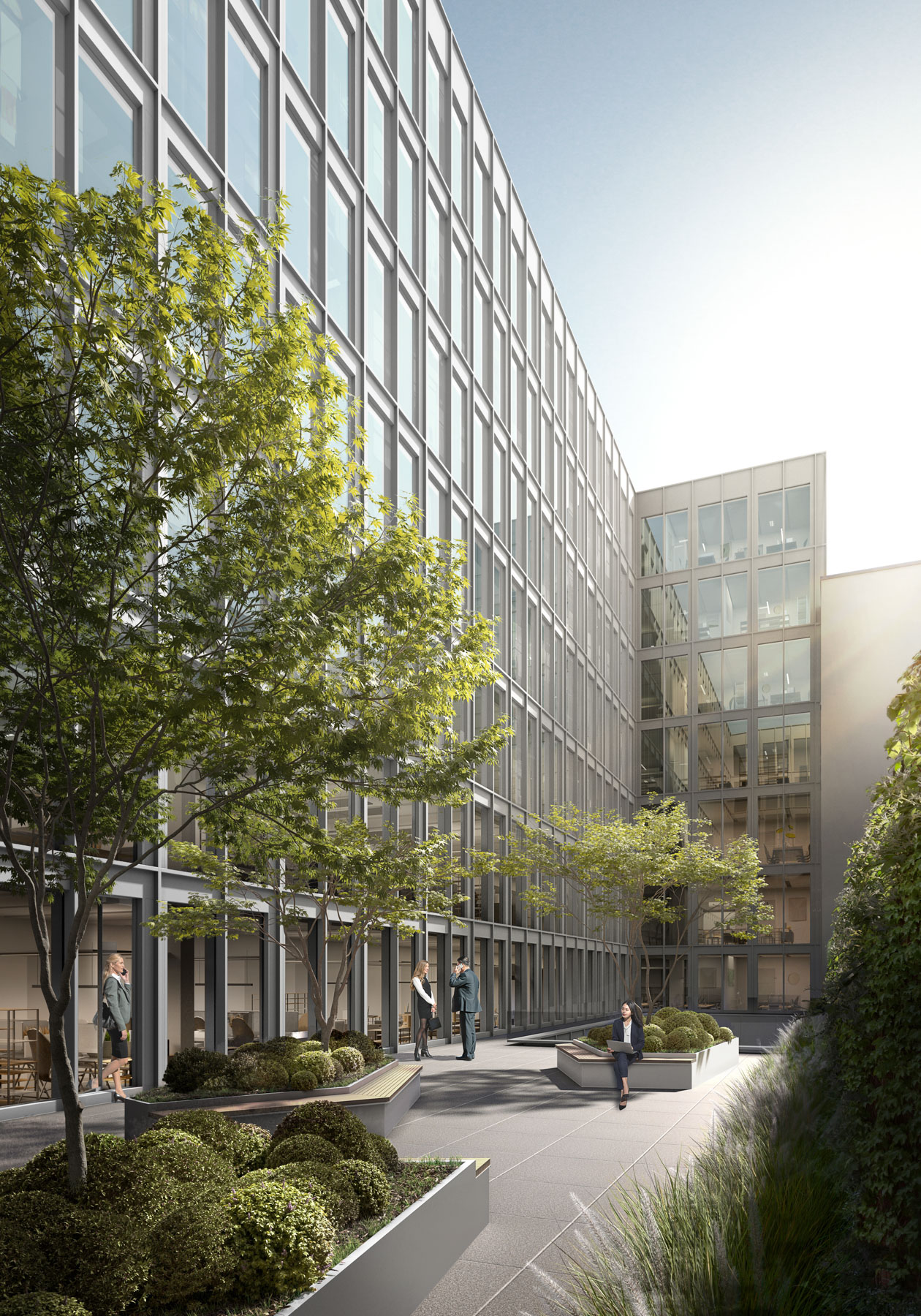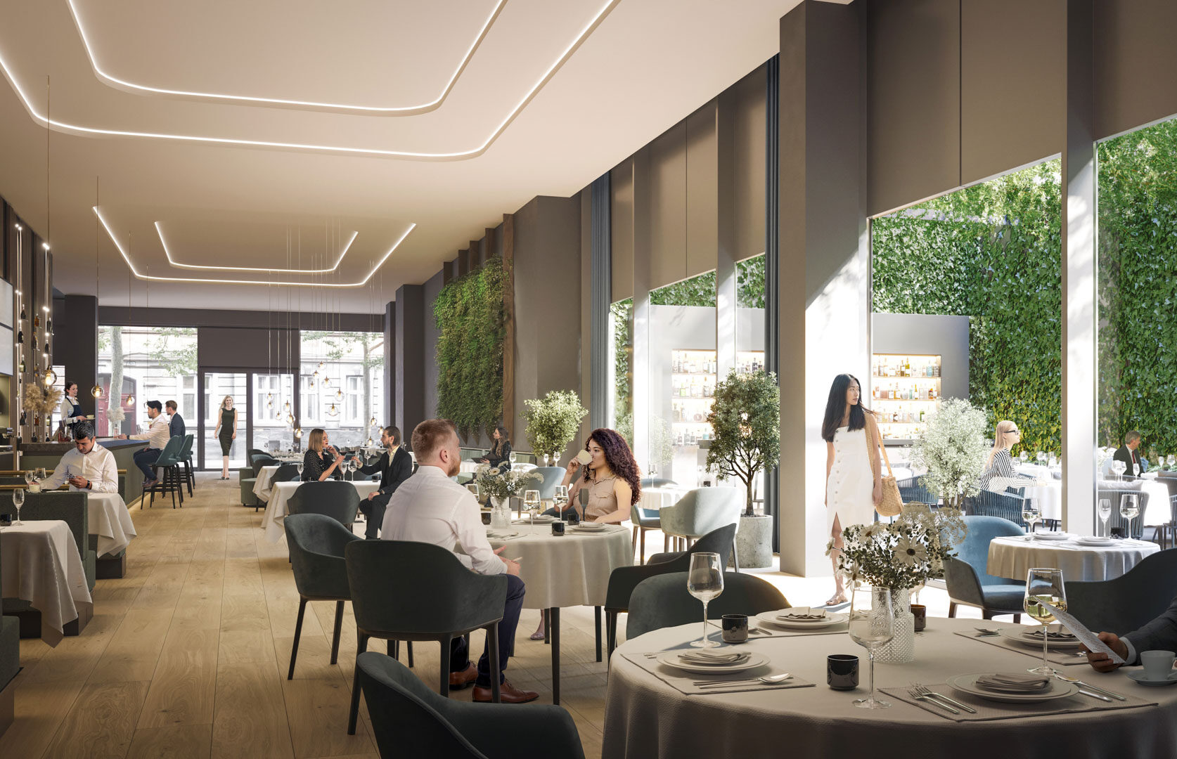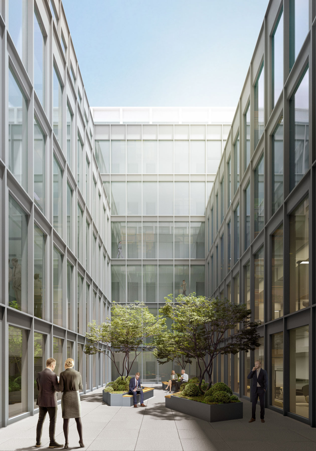 Gemeinsam mit den Retailflächen im Erdgeschoss steht der Gastronomiebereich inklusive Terrasse im Innenhof für die Multifunktionalität des Gebäudes und seine Offenheit – als Ort der Begegnung für Mieter und Besucher.